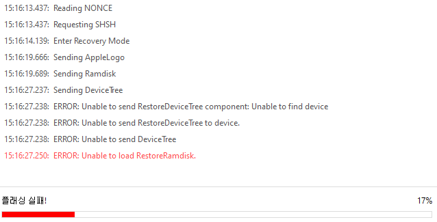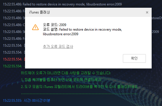 15:22:55.554: 플래싱 오류 설명: Failed to restore device in recovery mode, libusbrestore error:2009