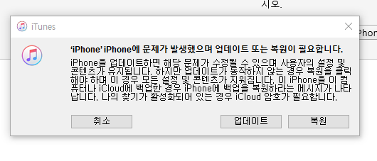 아이튠즈에 연결하면 이런 메세지와 함께 최근? 복구를 할 수 있는 업데이트 파일이 받아진다.