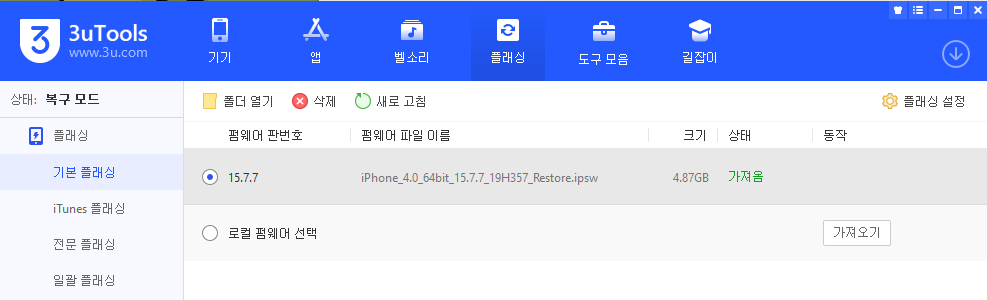 3utools 에서도 플래싱? 기능을 이용하여 초기화하거나 복구할 수 있다.